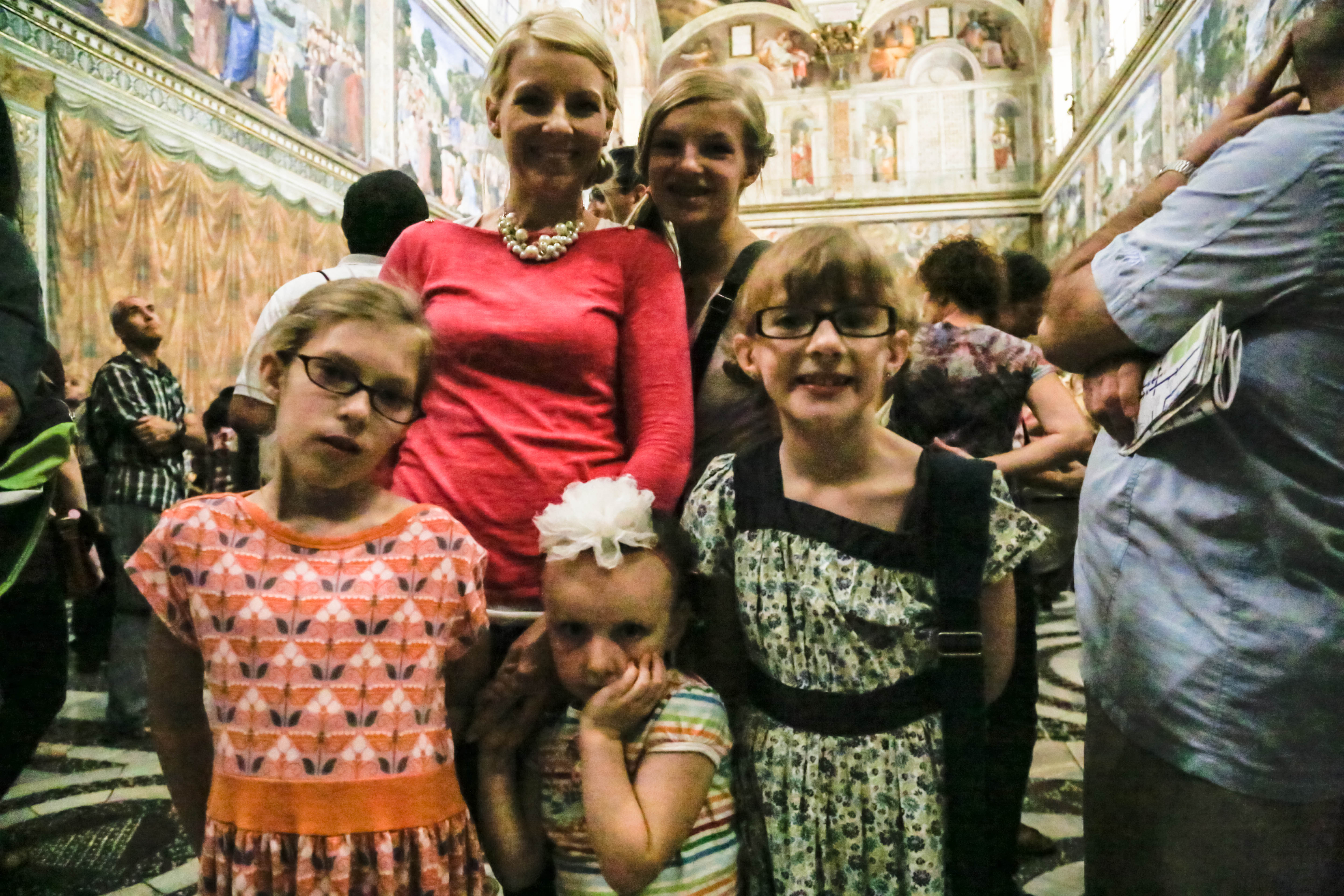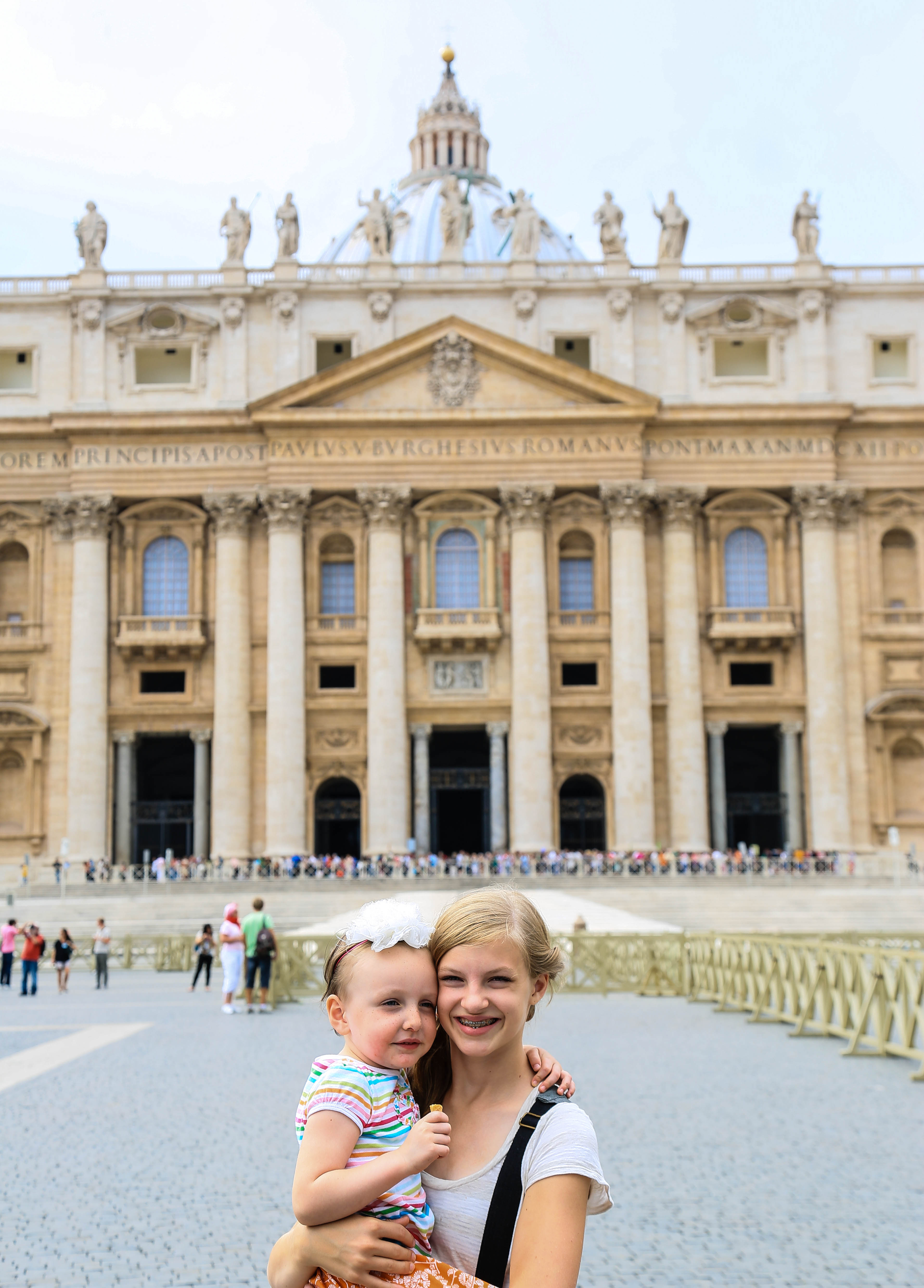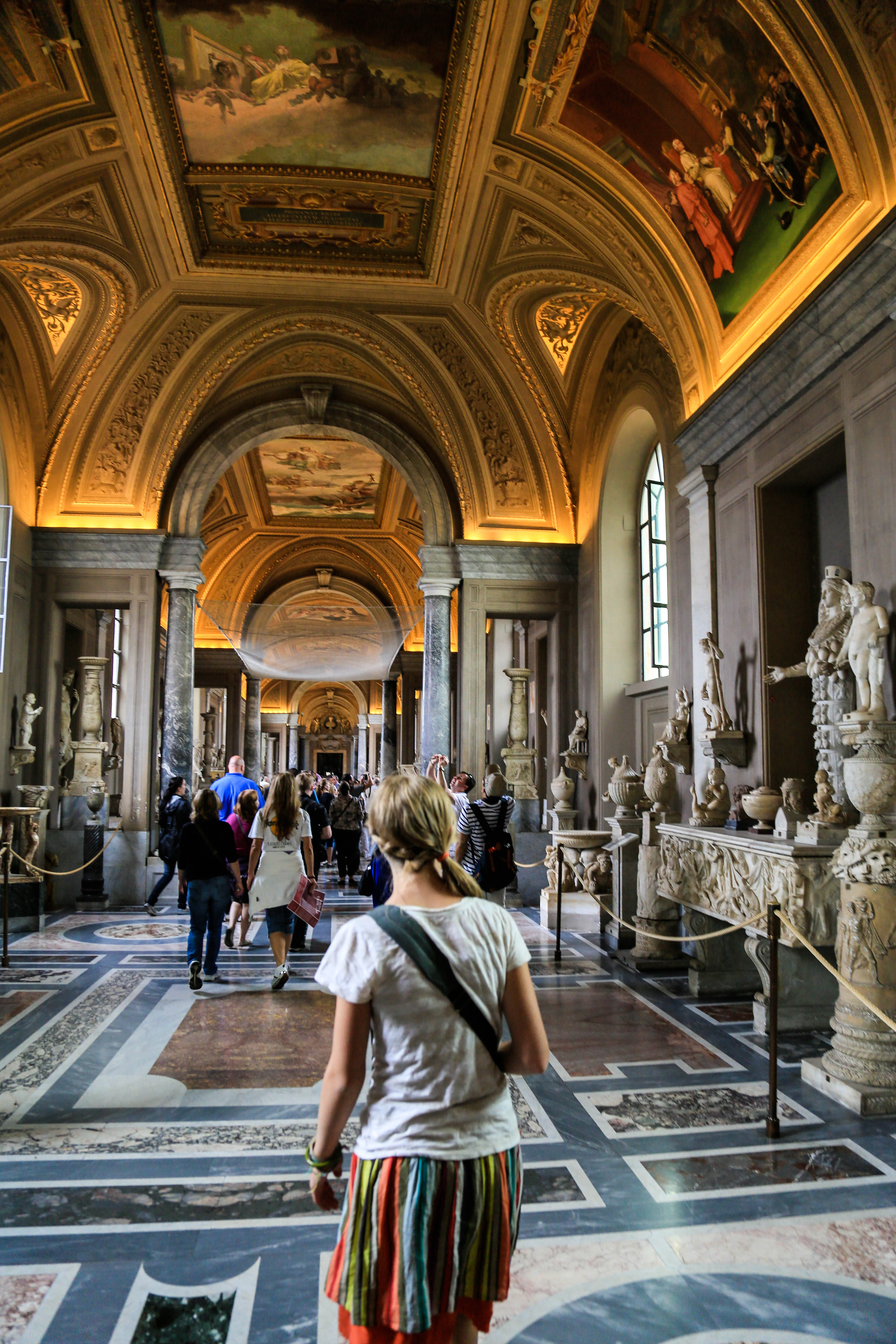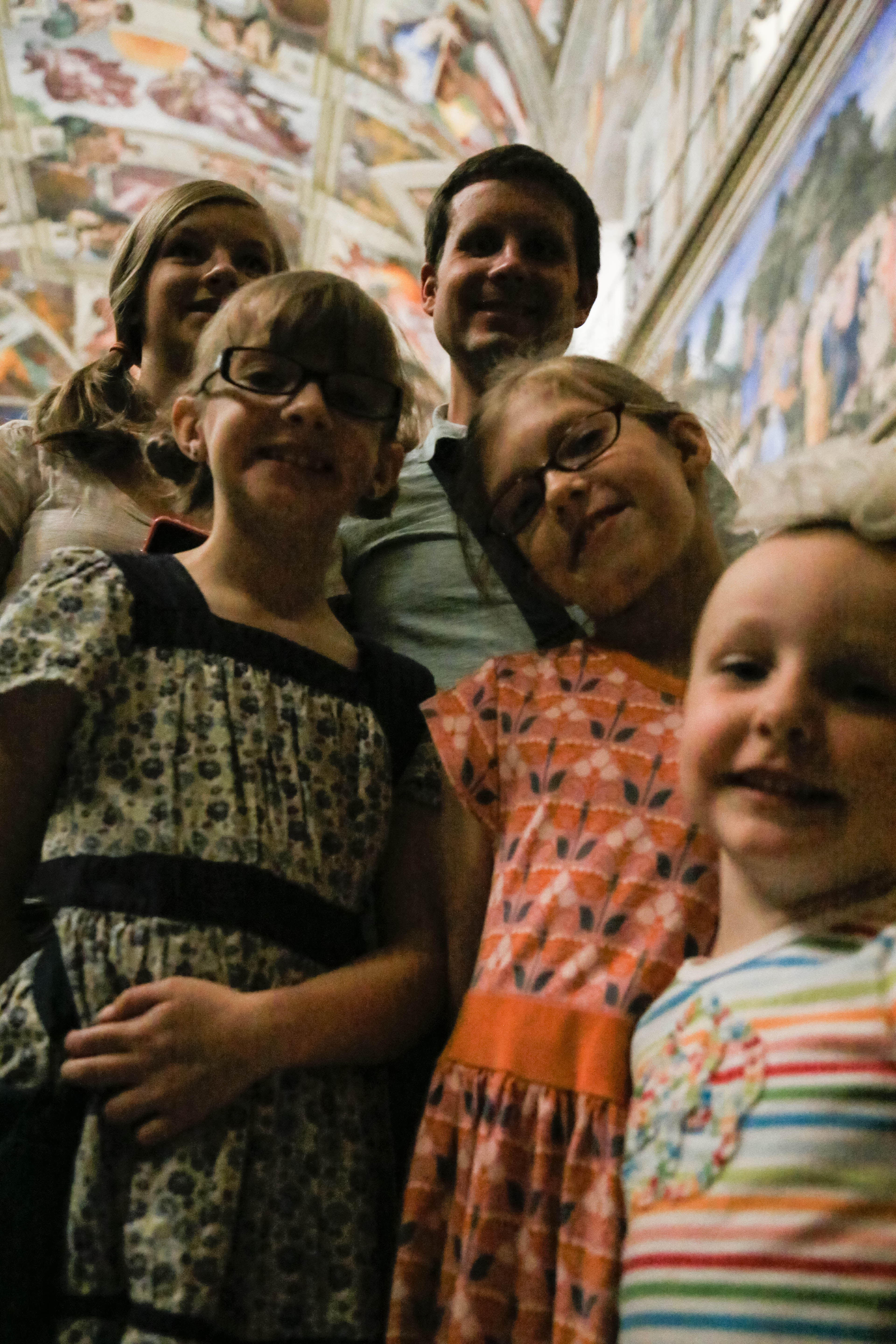 bus, metro, and finally arrived to the vatican. we bought and reserved tickets last night, and walked up with no line, which is awesome! our appt. time was 11:30, which isn’t that early, so you’d expect a huge line by that point, but there wasn’t. we bee-lined for the sistine chapel as soon as we got in, knowing the girls wouldn’t last too long. i think it took us walking the halls of the vatican for 30 minutes before we finally came to the sistine chapel. and that wasn’t looking at works of art, admiring sculptures, or admiring really much of anything. that was walking straight to the sistine chapel. it was absolutely beautiful and worth it! this is jarom and mine’s second time, but it was so great having our girls there this time, and seeing michelangelo’s amazing ceiling that took four years, on his back on scaffolding, with his arm up and paint falling and dripping into his eye. what an inspired man.