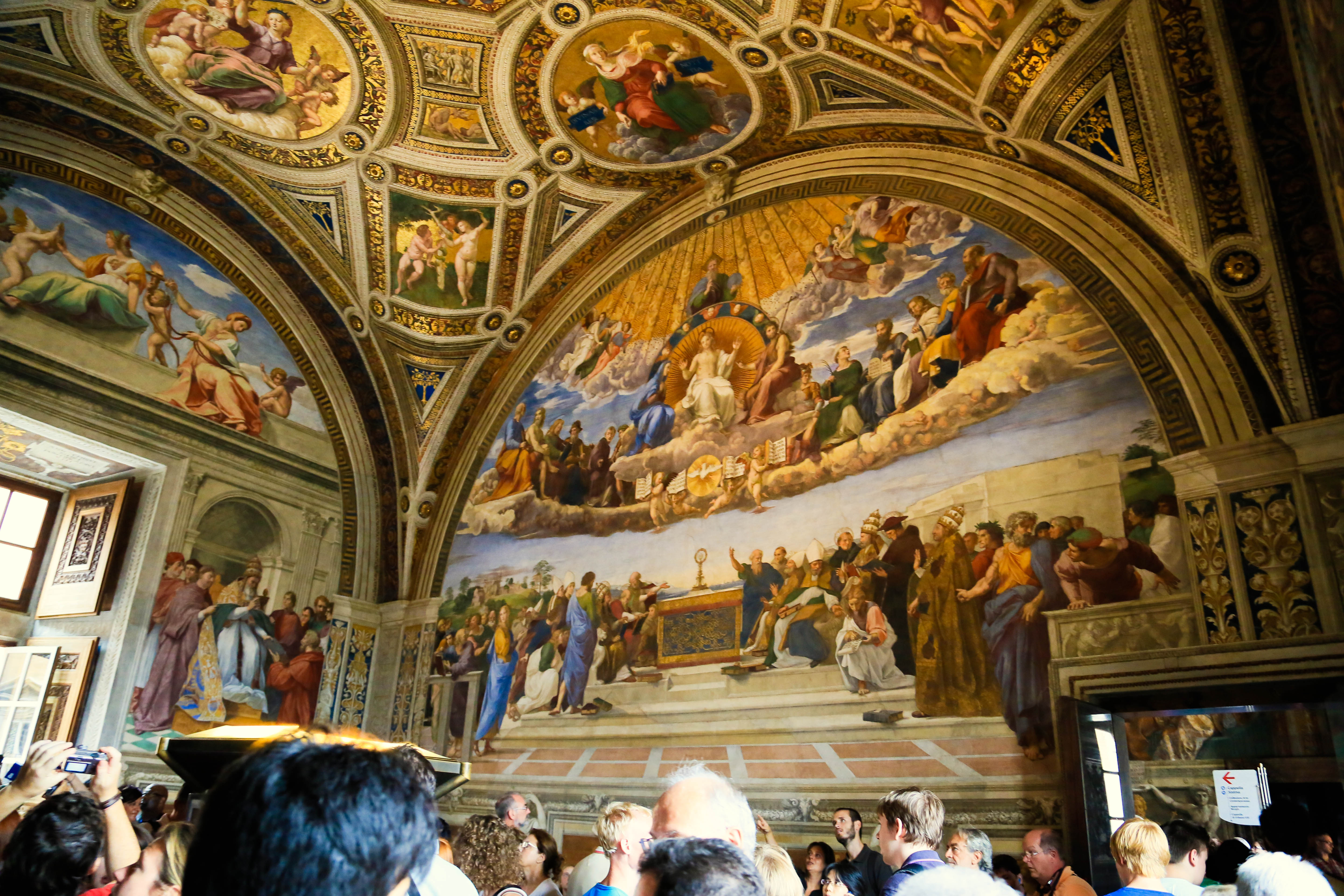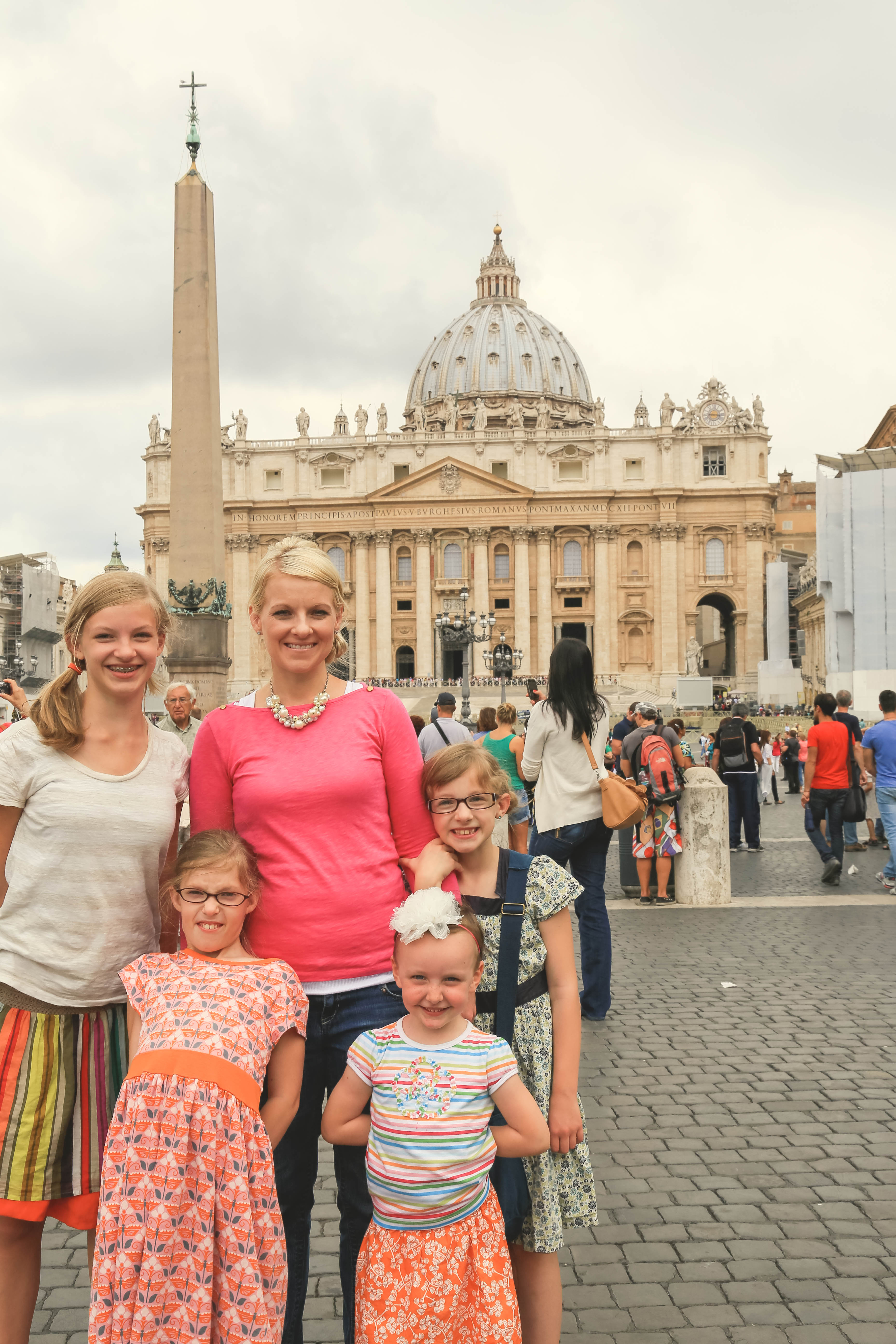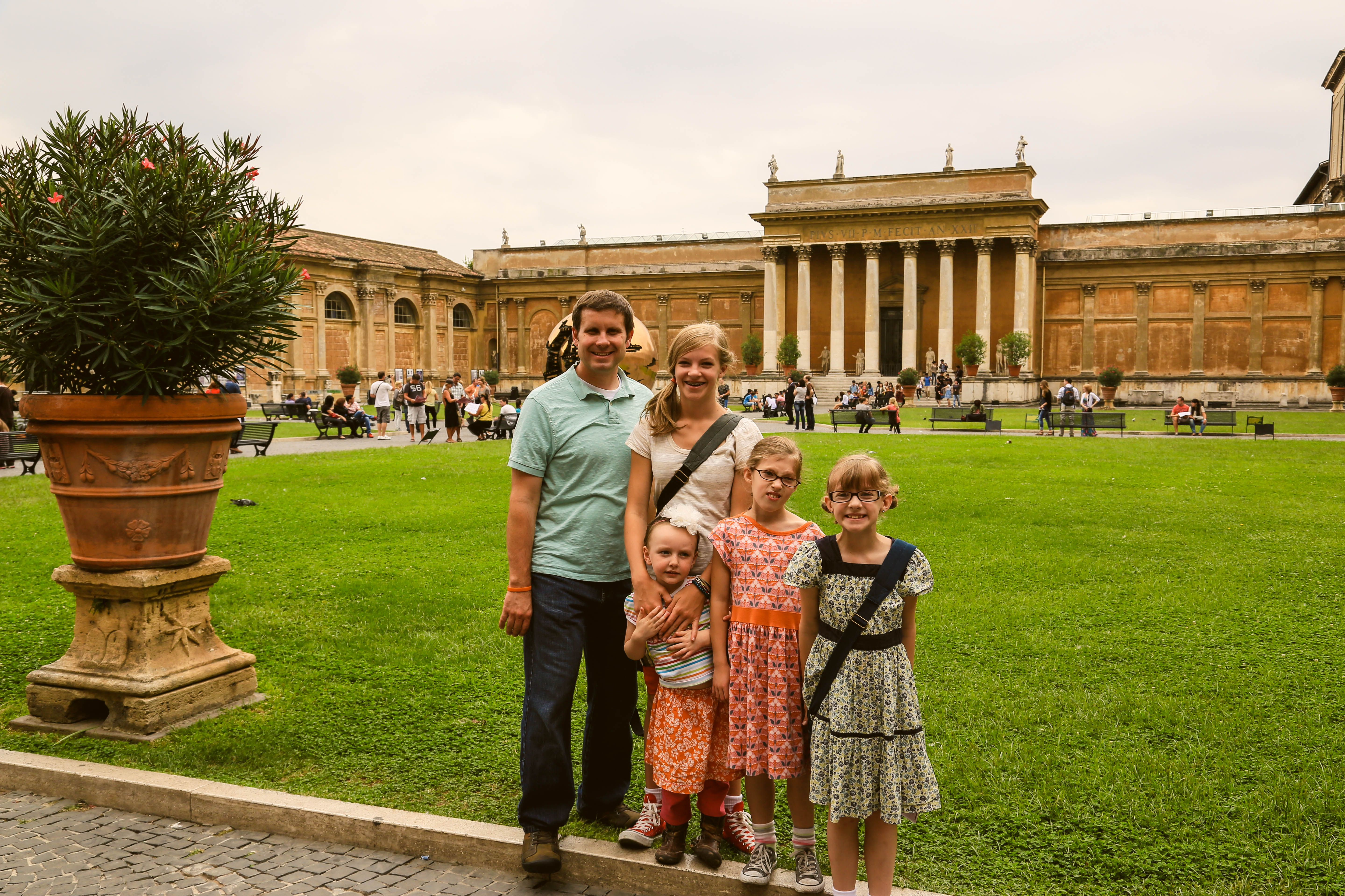bus, metro, and finally arrived to the vatican. we bought and reserved tickets last night, and walked up with no line, which is awesome! our appt. time was 11:30, which isn’t that early, so you’d expect a huge line by that point, but there wasn’t. we bee-lined for the sistine chapel as soon as we got in, knowing the girls wouldn’t last too long. i think it took us walking the halls of the vatican for 30 minutes before we finally came to the sistine chapel. and that wasn’t looking at works of art, admiring sculptures, or admiring really much of anything. that was walking straight to the sistine chapel. it was absolutely beautiful and worth it! this is jarom and mine’s second time, but it was so great having our girls there this time, and seeing michelangelo’s amazing ceiling that took four years, on his back on scaffolding, with his arm up and paint falling and dripping into his eye. what an inspired man.